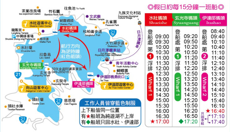 水社碼頭出發,分別停靠伊達邵碼頭、玄光寺碼頭,皆有不同觀光景點